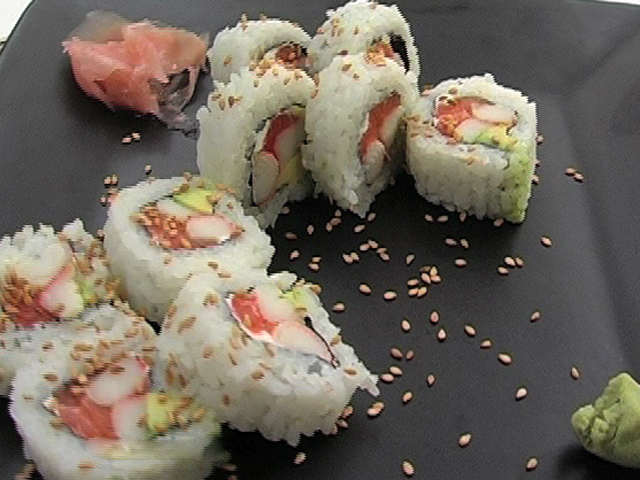 Роллы «Хура-маки».Состав:рис — 60 гр;нори — 1/2 листа;свежий лосось — 30 гр;мясо краба — 30 гр;сливочный сыр — 1 столовая ложка;авокадо — 1/2 штуки;маринованный имбирь, васаби, кунжут — по вкусу.